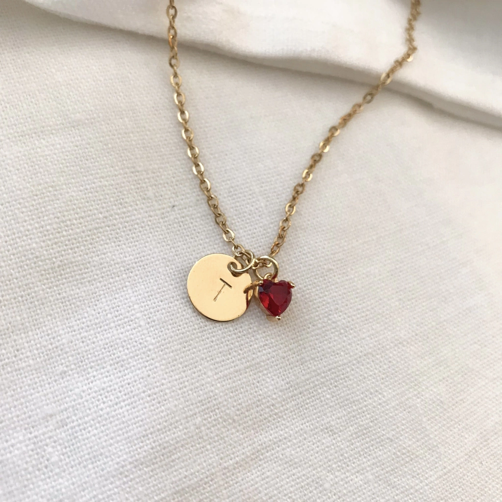 Material: cadena de acero bañado en oro, dije circular de oro laminado, dije de corazon oro laminado con zirconia roja. Letra grabada a mano.