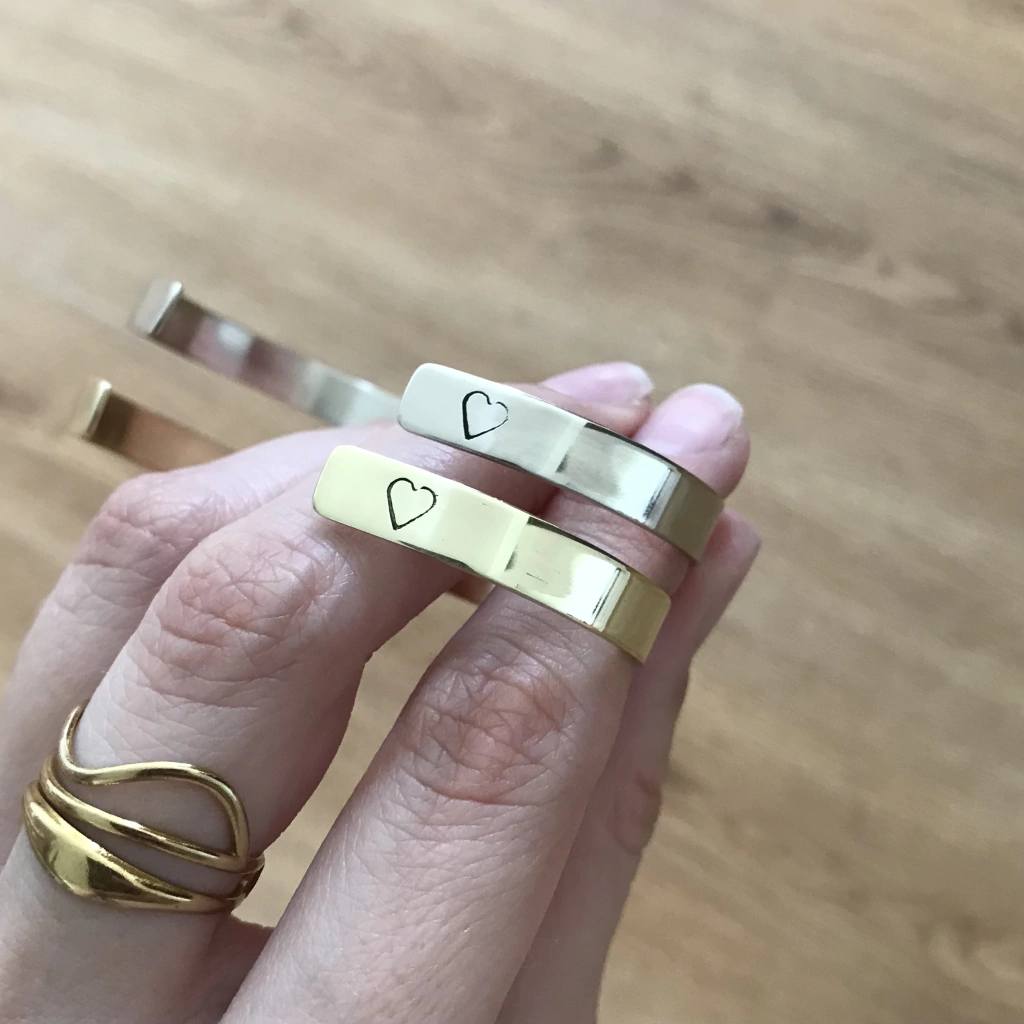 Se puede grabar por adentro y por afuera de la pulsera, tambien centrado o en los extremos. Aclarar en el espacio de grabado todas estas especificaciones. Se pueden grabar palabras, frases, nombres, fechas, etc. El grabado es totalmente personalizado.